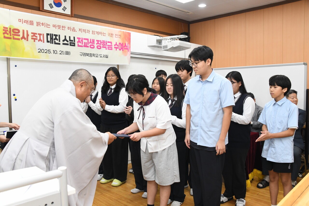 천은사는 10월 21일 구례북중학교 도서실에서 ‘2025년 장학금 수여식’을 열고 전교생 28명에게 각 30만 원씩 총 840만 원의 장학금을 전달했다.