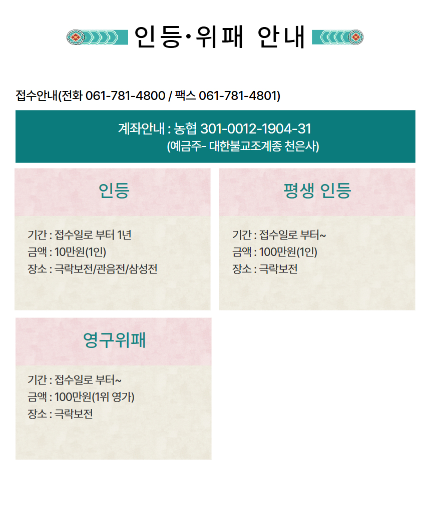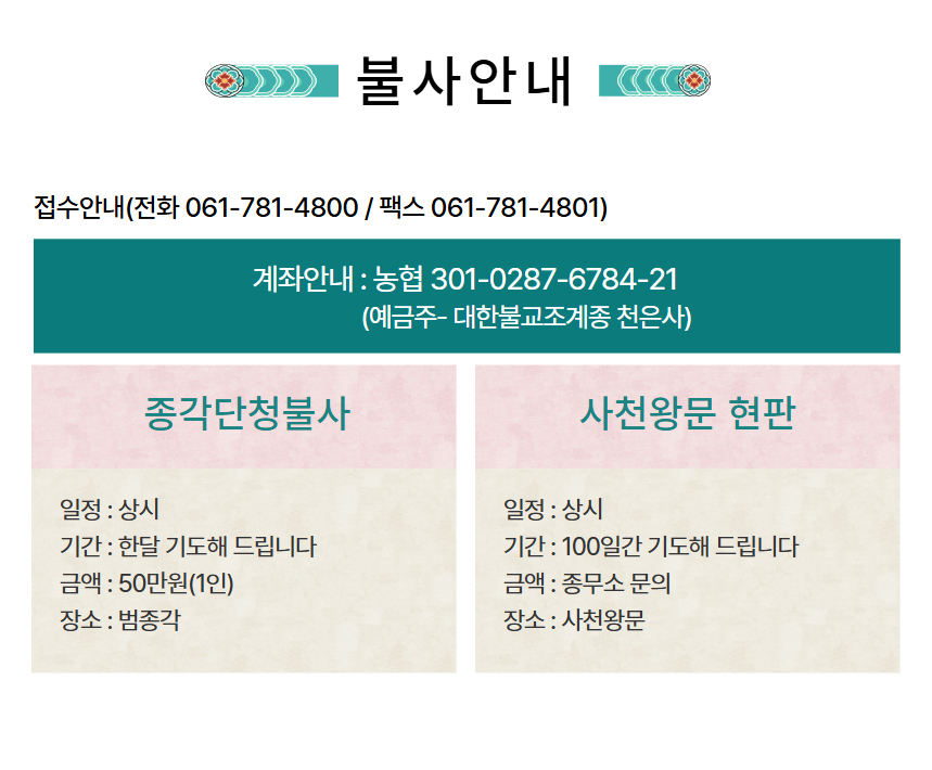 입금계좌번호  :  농협 301-0012-1904-31 [ 예금주 : 천은사 ]