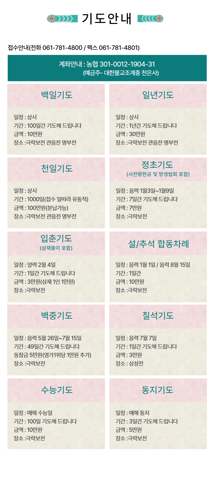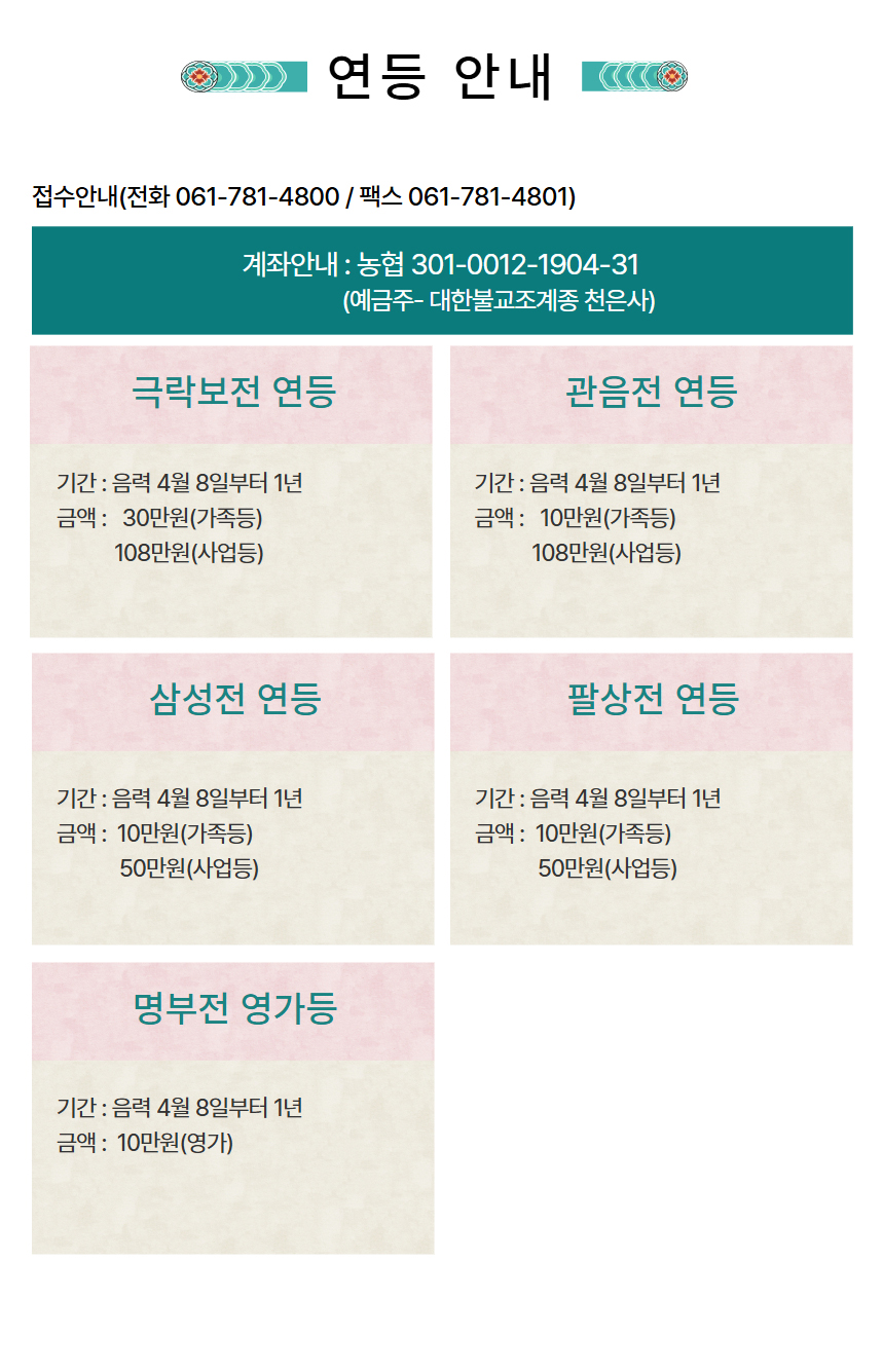 입금계좌번호  :  농협 301-0012-1904-31 [ 예금주 : 천은사 ]